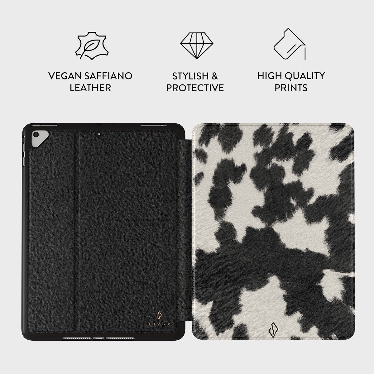 * The case is not textured-it is a printed pattern *Your iPad deserves to look cute and stay protected at all times. and our Achromatic iPad 9.7 (6th/5th Gen) folio case will help you keep it safe and sound. The cow print in black and white is both daring and classic. making it the perfect addition to your accessory collection.